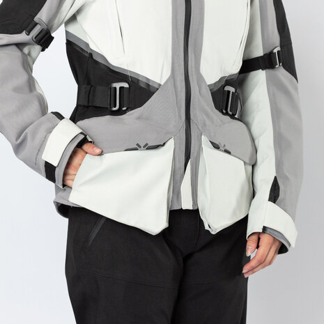 De jas is voorzien van CE-gecertificeerde protectoren op schouders en ellebogen en een voorbereide ruimte voor een rugprotector. Met een slanke, vrouwelijke pasvorm en verstelbare taille, armen en manchetten biedt de Tourster-STX 1.0 optimaal comfort tijdens lange ritten of dagelijks gebruik.